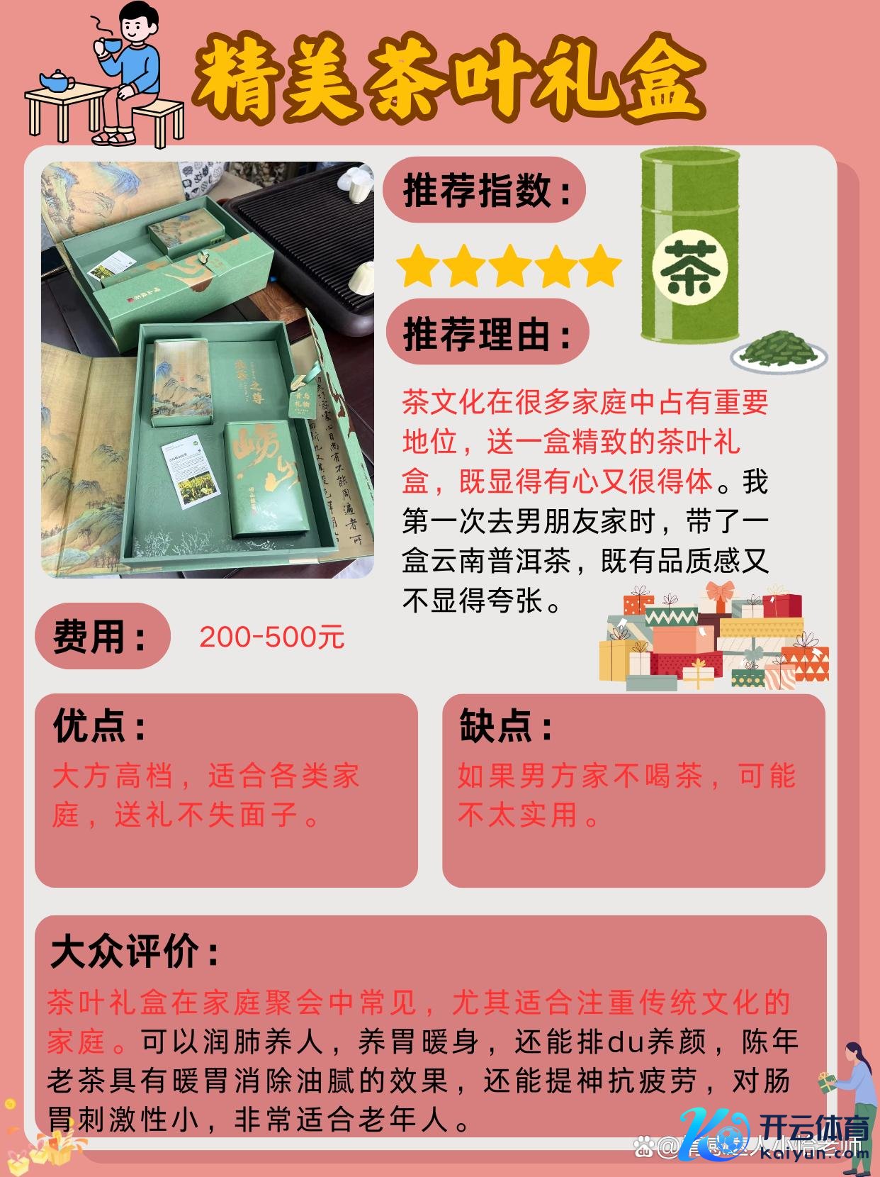 推选指数:⭐⭐⭐⭐⭐价钱:约200-500元推选事理:茶文化在许多家庭中王人是一个进军的元素,尤其是男方家如若对茶有风趣,送一盒细致的茶叶礼盒会超越加分。我第一次去男一又友家时,带了一盒来自云南的普洱茶,不仅包装良好,茶叶自身也有品性感,男一又友家东说念主也很可爱。优点:高等大方,适宜任何家庭,耸立不失排场。症结:如若男方家莫得喝茶的习气,可能会有点花消。群众评价:茶叶礼盒在许多家庭约聚中王人很受接待,尤其是在一些重视传统礼节的家庭。