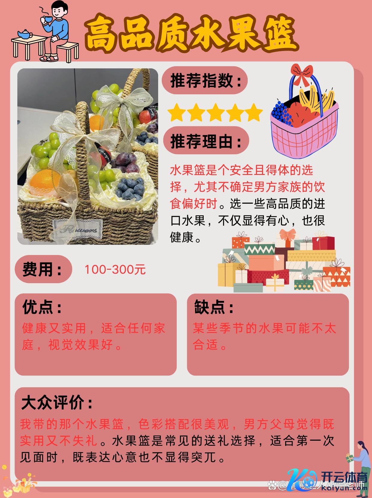 推选指数:⭐⭐⭐⭐价钱:约100-300元推选事理:生果篮是一个超越安全且多礼的遴荐,尤其是如若你不知说念男方眷属的饮食偏好时。遴荐高品性的生果,比如入口的葡萄、橙子、苹果等,不仅显得有心,也很健康。我那时辰买了一个生果篮,色调搭配得很好意思不雅,男方的父母以为既实用又不失仪。优点:健康,实用,适宜任何家庭,视觉成果好。症结:季节性互异,某些季节生果可能不太合适。群众评价:生果篮是许多东说念主王人会遴荐的安全礼物,尤其适宜第一次碰头时,既能暗示赤忱又不会过于草率。