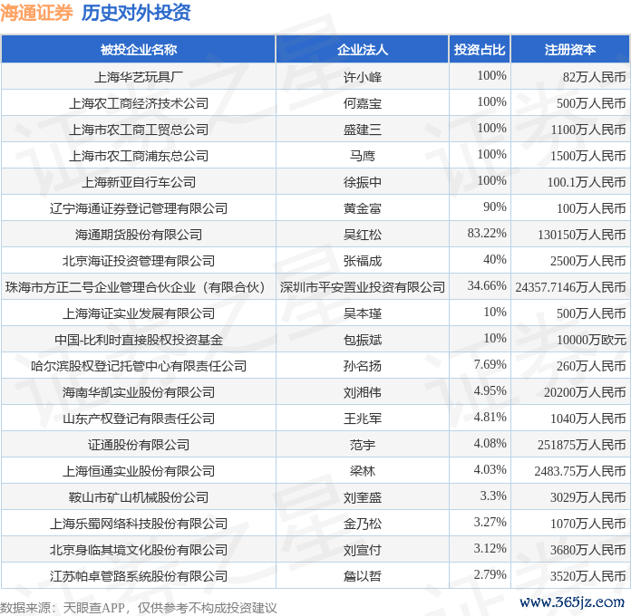 本站音尘,凭据天眼查APP走漏,海通证券(600837.SH)新增全部对外投资事件,被投资公司为华晋世界(北京)传媒股份公司,法定代表东谈目的伟,投资占比为2.61%。该公司从事播送、电视、电影和灌音制功课,注册成本为5100万东谈主民币。现在,海通证券共存在对外投资33项,投资占比前20的表情见下表: 通过天眼查大数据分析,海通证券股份有限公司共对外投资了40家企业,参与招投标表情3504次;财产足迹方面有商标信息73条,专利信息93条,著述权信息265条;此外企业还领有行政许可122个。据