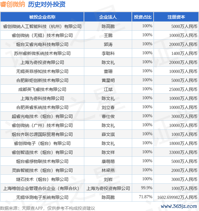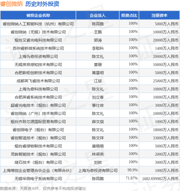 本站音尘,凭据天眼查APP暴露,睿创微纳(688002.SH)新增沿途对外投资事件,被投资公司为睿创微纳东谈主工智能科技(杭州)有限公司,法定代表东谈主陈高鹏,投资占比为100%。该公司从事软件和信息技巧就业业,注册老本为5000万东谈主民币。现在,睿创微纳共存在对外投资27项kaiyun体育网页版登录,投资占比前20的技俩见下表:
