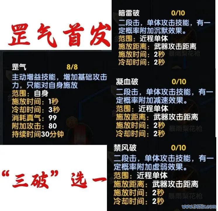 打BOSS/魁首罡气 + 暗雷破 (或凝血破/禁风破 - 三破任选其一,齐是两段伤害) + 宽泛抨击!