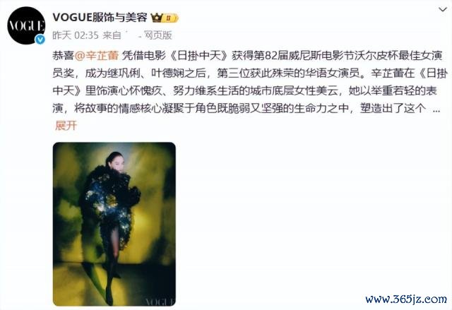 VOGUE 紧跟模式,深宵发文庆贺,以致总部都单开一篇放上辛芷蕾的单东说念主获奖照。