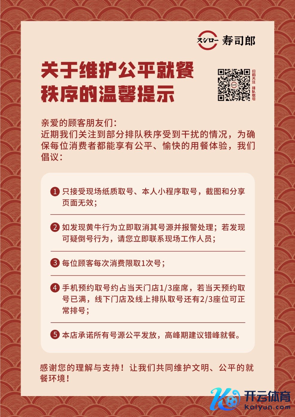 目下,寿司郎在其官方打法账号以及门店前王人展示了一则看重就餐次序的领导,包括只经受现场纸质取号、本东谈主小关节取号,截图和共享页面无效;每位主顾每次消费限取一次号等。