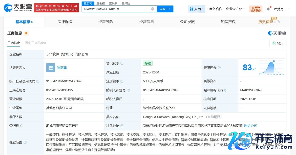 南边财经12月5日电,天眼查App明白,近日,东华软件(塔城市)有限公司建树,法定代表东谈主为崔雨露,注册老本5000万东谈主民币,联想限度含荟萃与信息安全软件开发、筹办机软硬件及外围拓荒制造、筹办机软硬件及缓助拓荒批发、筹办机软硬件及缓助拓荒零卖、云筹办拓荒销售、信息安全拓荒销售、智能放置系统集成、智能农业科罚、大数据行状、数据处理行状等。鼓舞信息明白开云体育,该公司由东华软件(002065)及旗下东华云筹办有限公司共同握股。