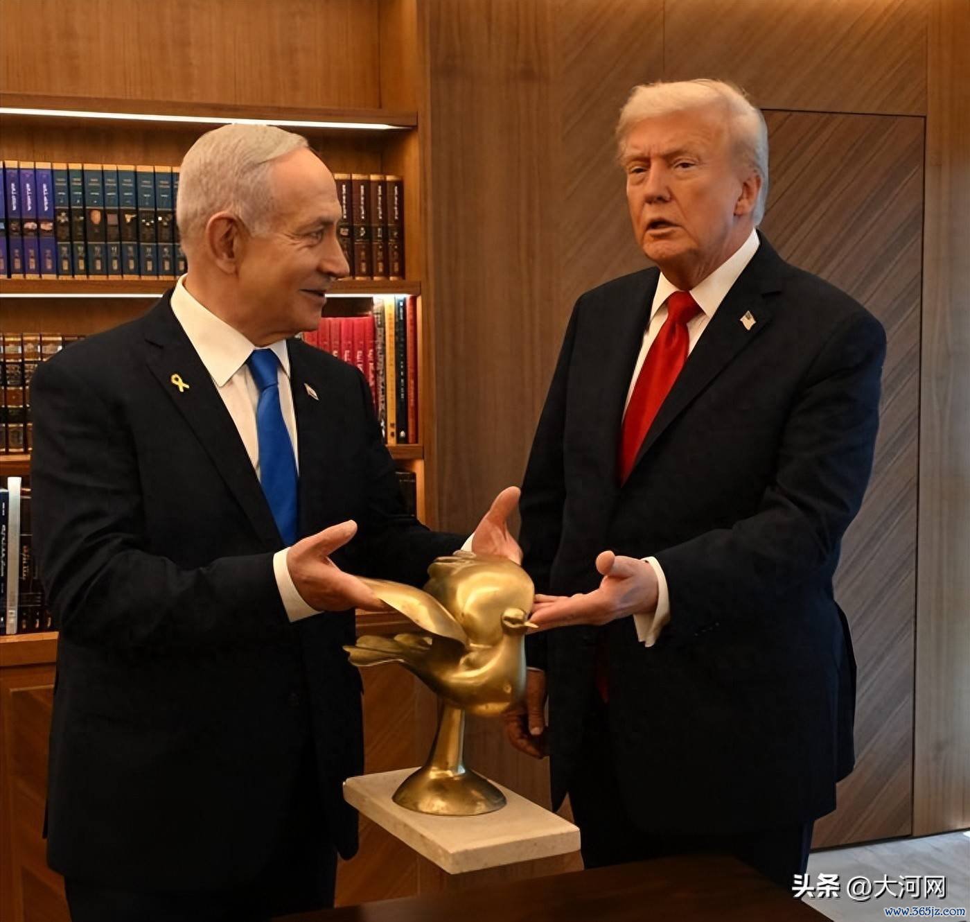 本日,内塔尼亚胡在外交媒体平台X上发布了多张对于特朗普到访的图片,其中包括他向特朗普拯救金色鸽子雕镂的图片。